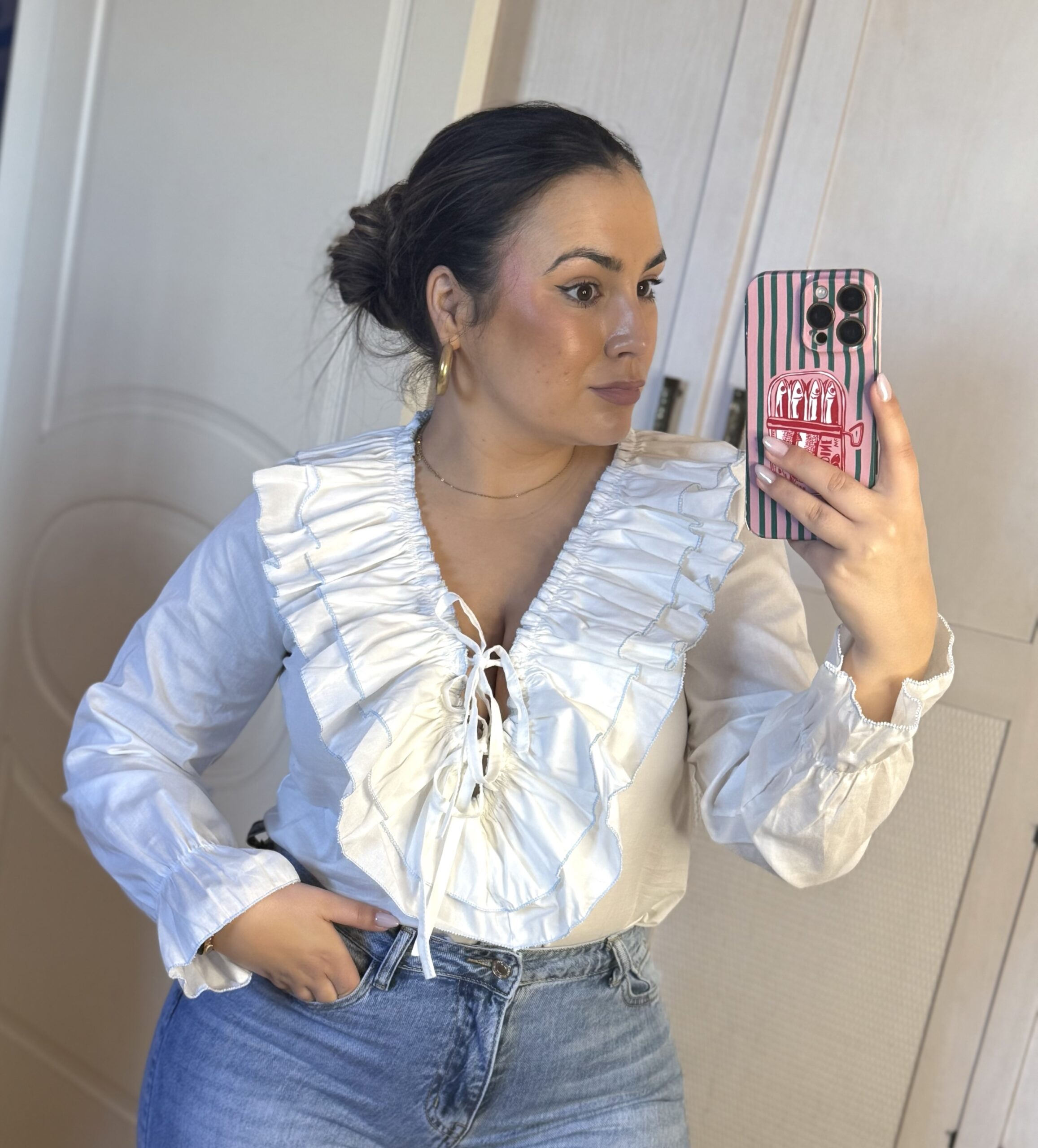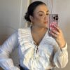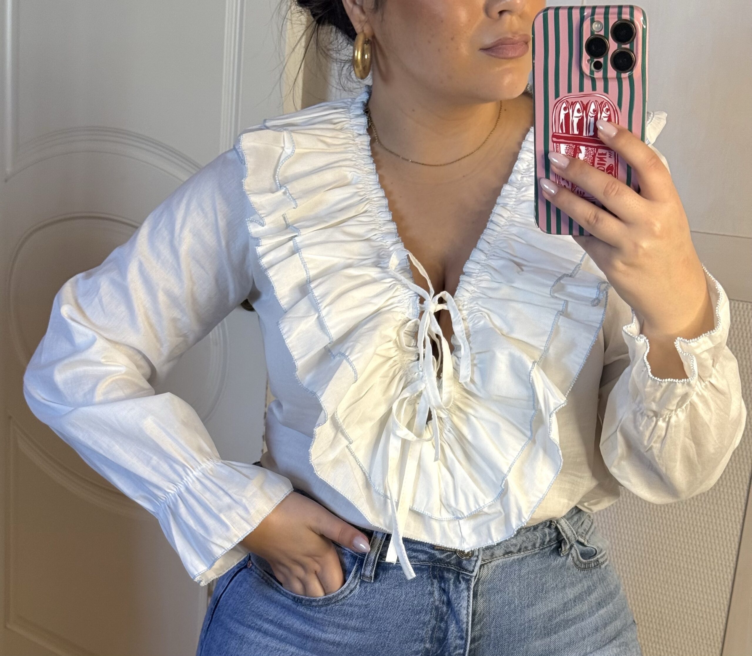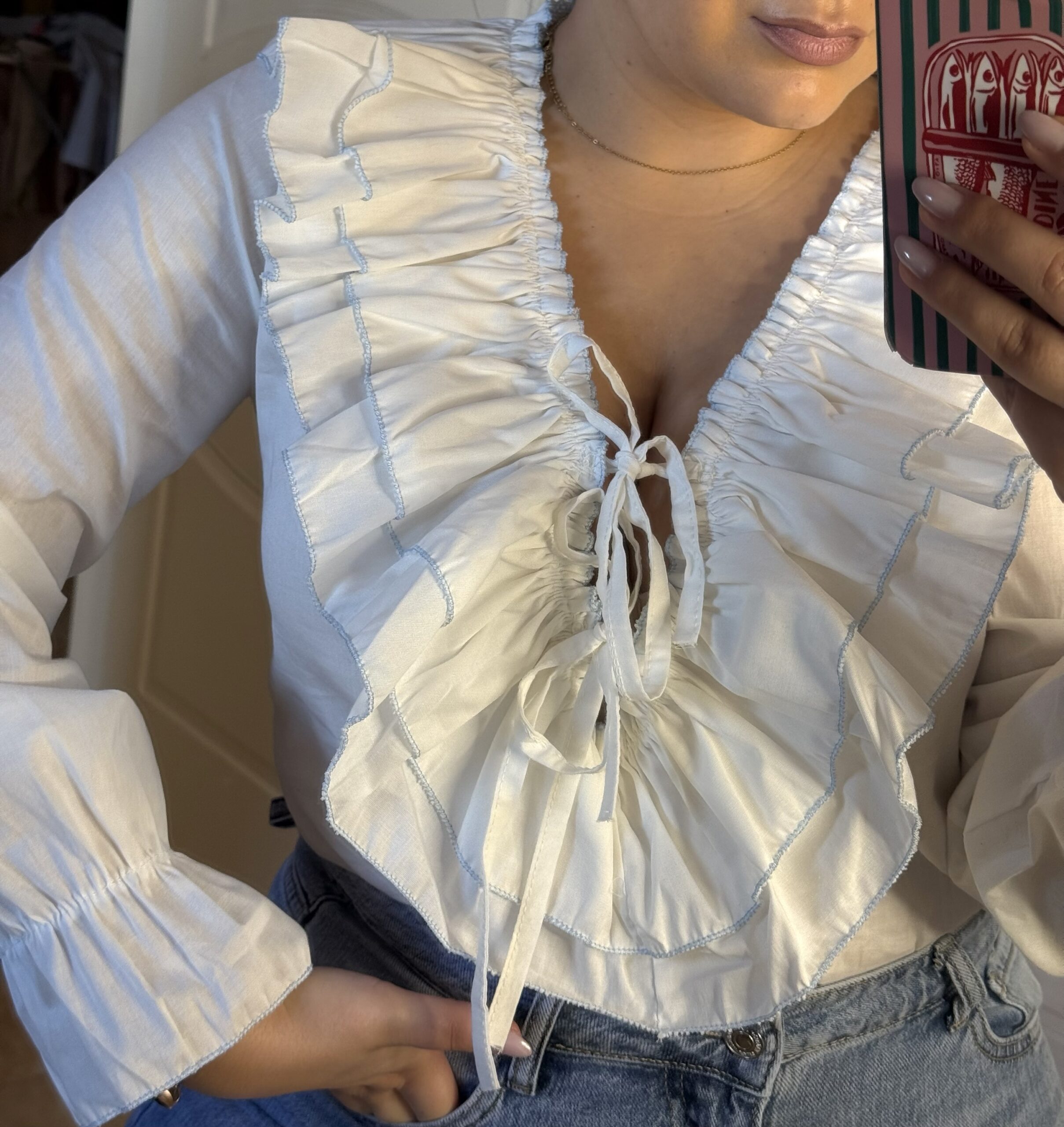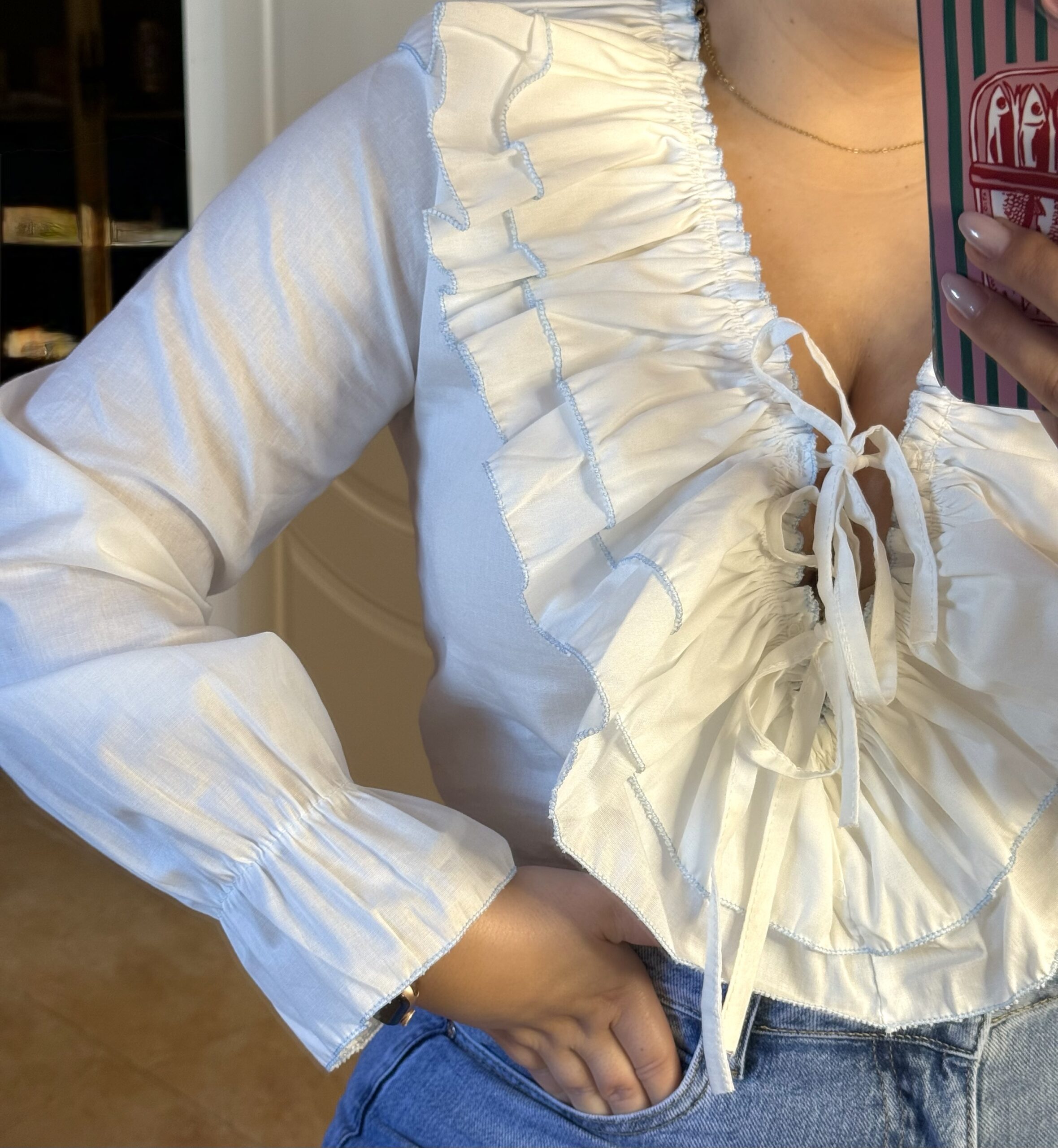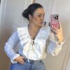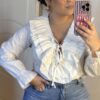 Blusa blanca de tejido ligero con escote en pico y volantes fruncidos rematados en delicado ribete azul. Cierre frontal con lazada ajustable y mangas largas con puño fruncido. Femenina, elegante y muy versátil, ideal para combinar con vaqueros o looks más arreglados.