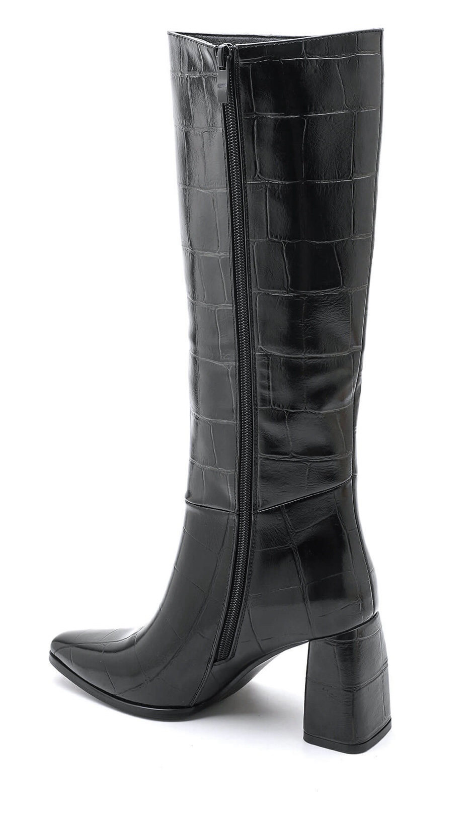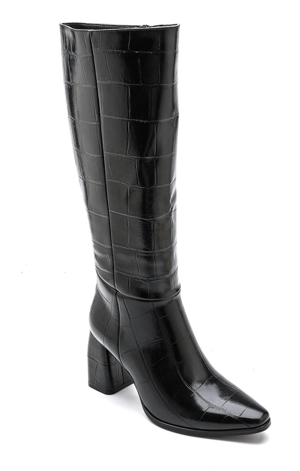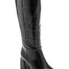 Apuesta por la elegancia atemporal con estas botas altas en efecto piel de cocodrilo. Su tono negro aporta un toque sofisticado y versátil, ideal para elevar cualquier look de otoño e invierno.