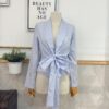 Camisa cruzada de rayas en tono azul claro, con raya en burdeos, con diseño tipo blazer y lazada frontal que realza la silueta. Su tejido ligero y su corte elegante la convierten en una prenda ideal para primavera. Perfecta para combinar con vaqueros o pantalones de vestir y crear looks sofisticados y actuales.