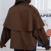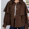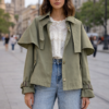 Chaqueta corta estilo trench en color chocolate, con forro interior, diseño de capa superior y cierre de botones. Cuenta con cuello camisero, bolsillos delanteros y mangas con trabilla ajustable. Cómoda, elegante y perfecta para entretiempo.