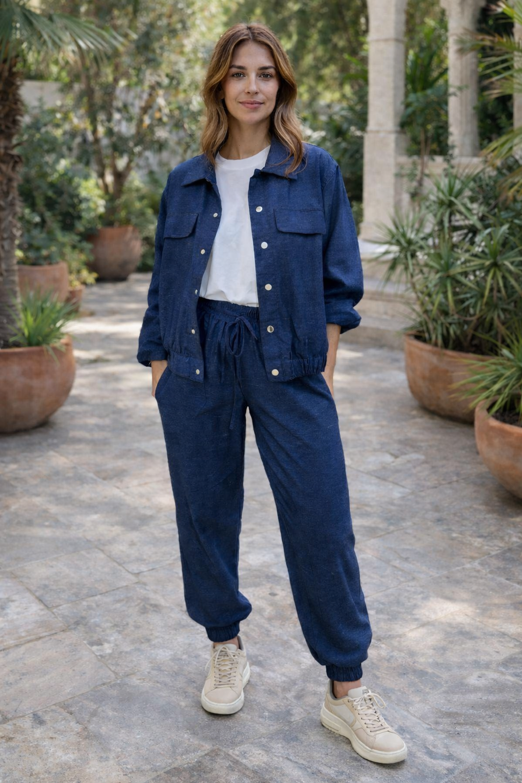 Conjunto casual de mujer en color azul marino compuesto por bomber con botones y bolsillos delanteros y pantalón jogger con cintura elástica y cordón ajustable.