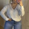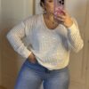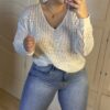 Jersey de hilo en color marfil con diseño calado y delicadas lentejuelas transparentes que aportan un brillo sutil y elegante. Su tejido ligero y transpirable lo convierte en una prenda perfecta para entretiempo o noches de verano.